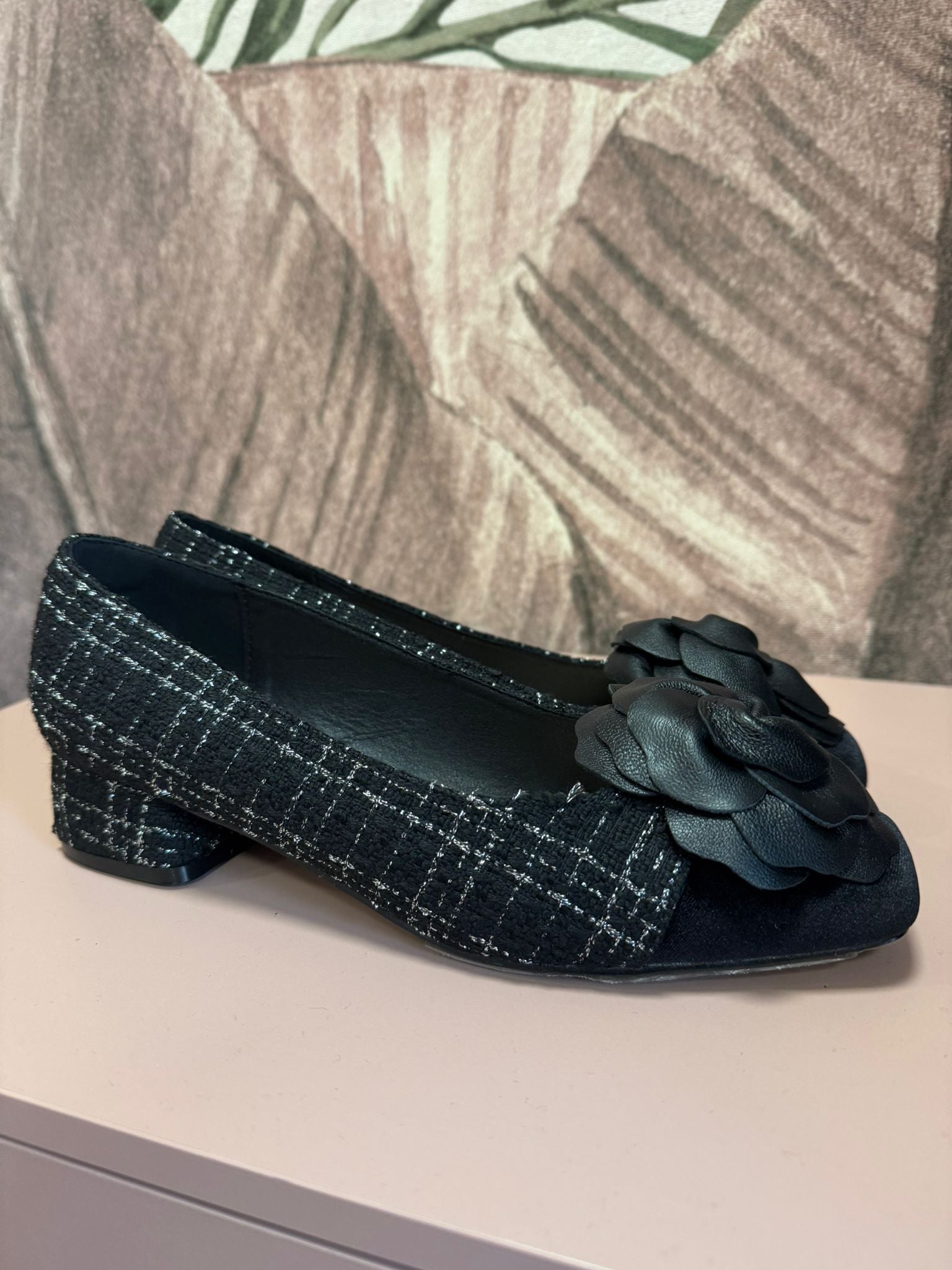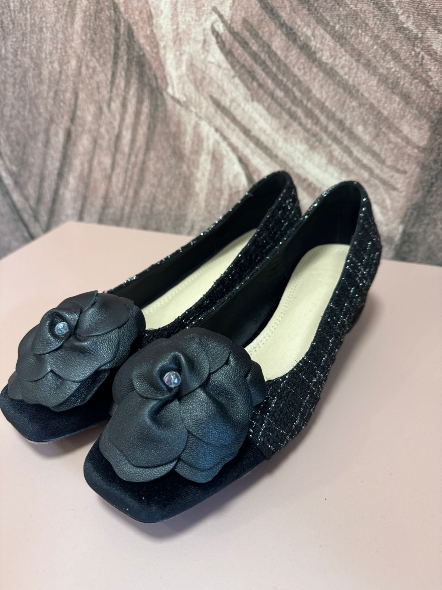Ballerina con punta quadrata in tessuto tweed laminato, con fiore clip in punta