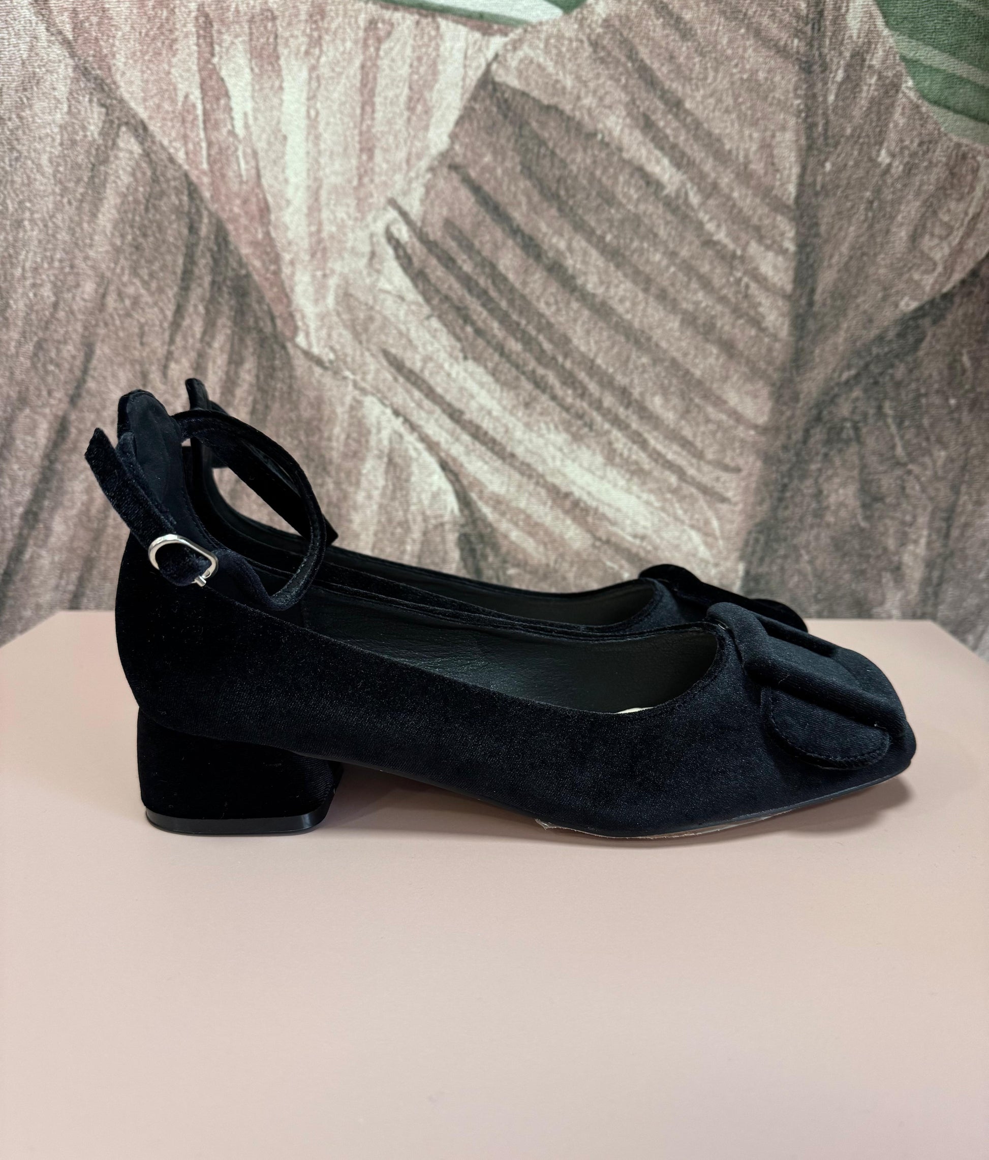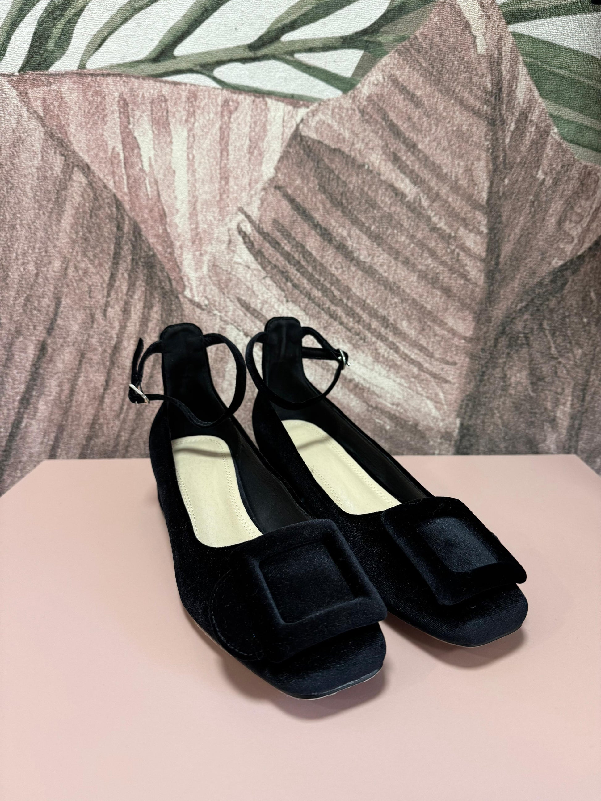Ballerina in velluto nero con tacco basso e fibbia in matching color