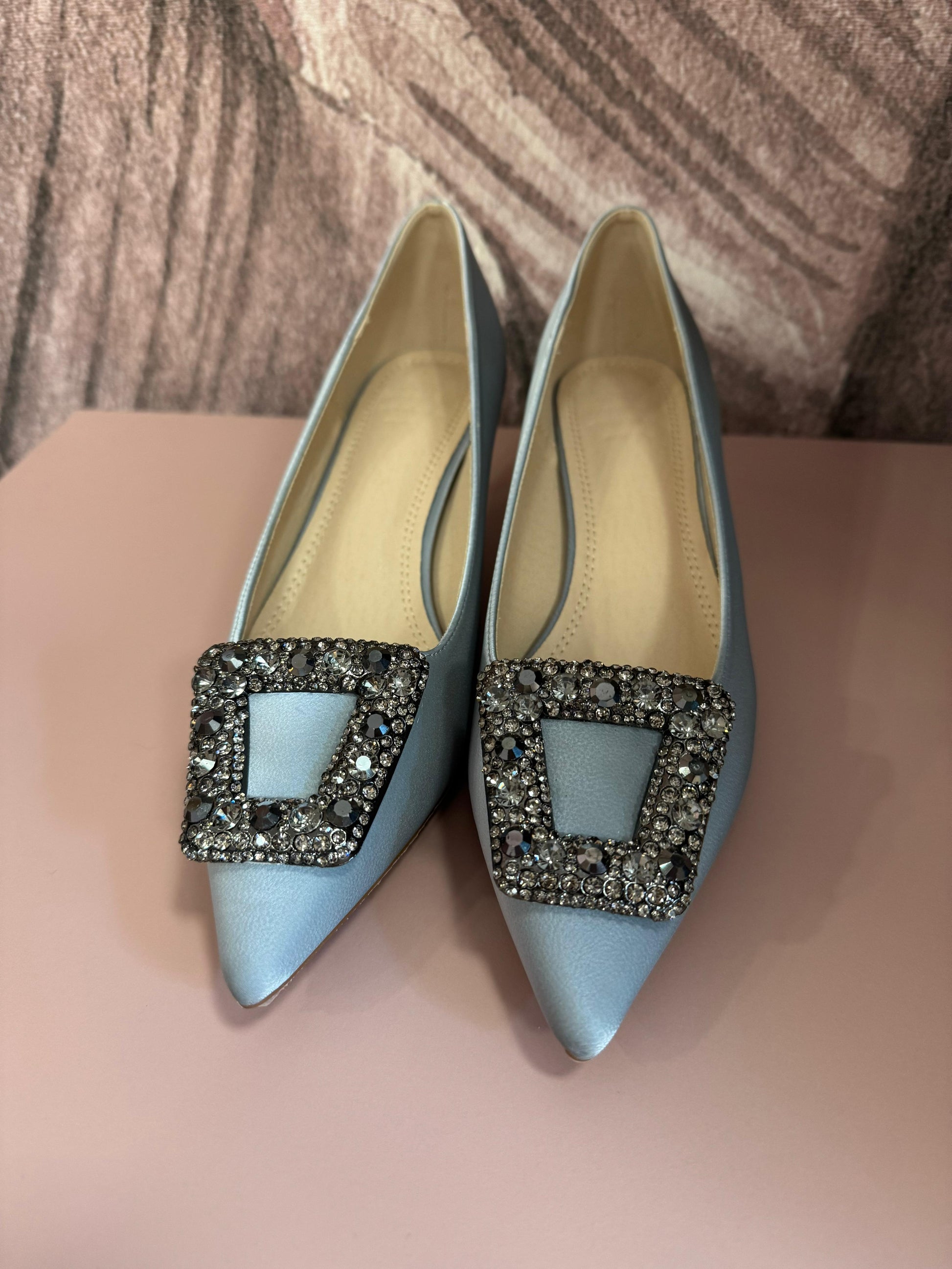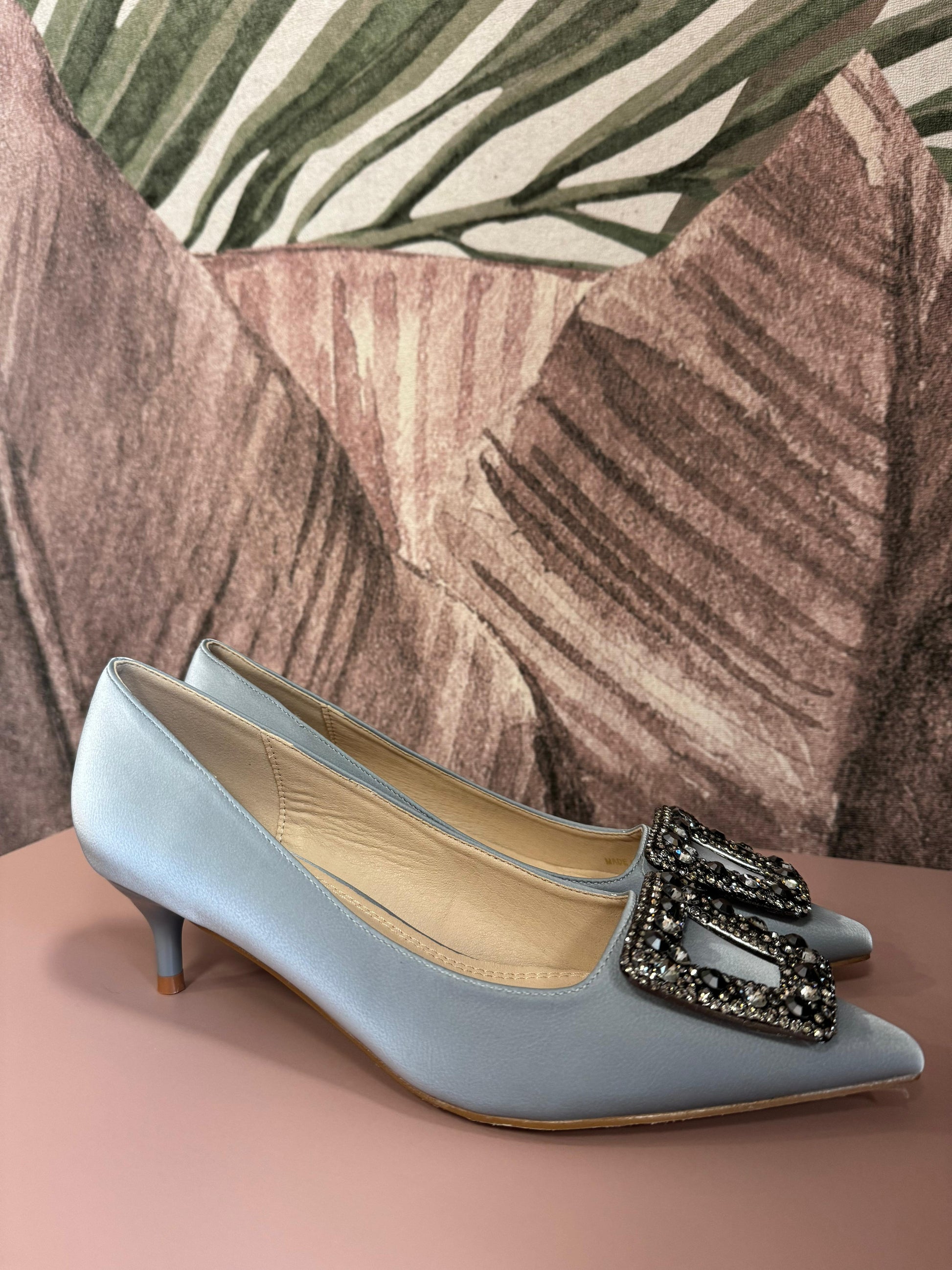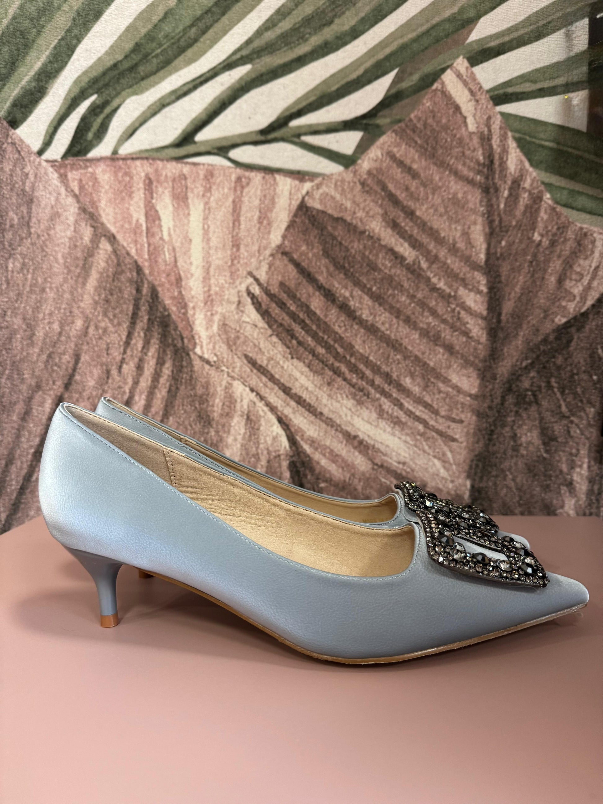 Décolleté in tessuto tecnico color perla impreziosito da fibbia gioiello