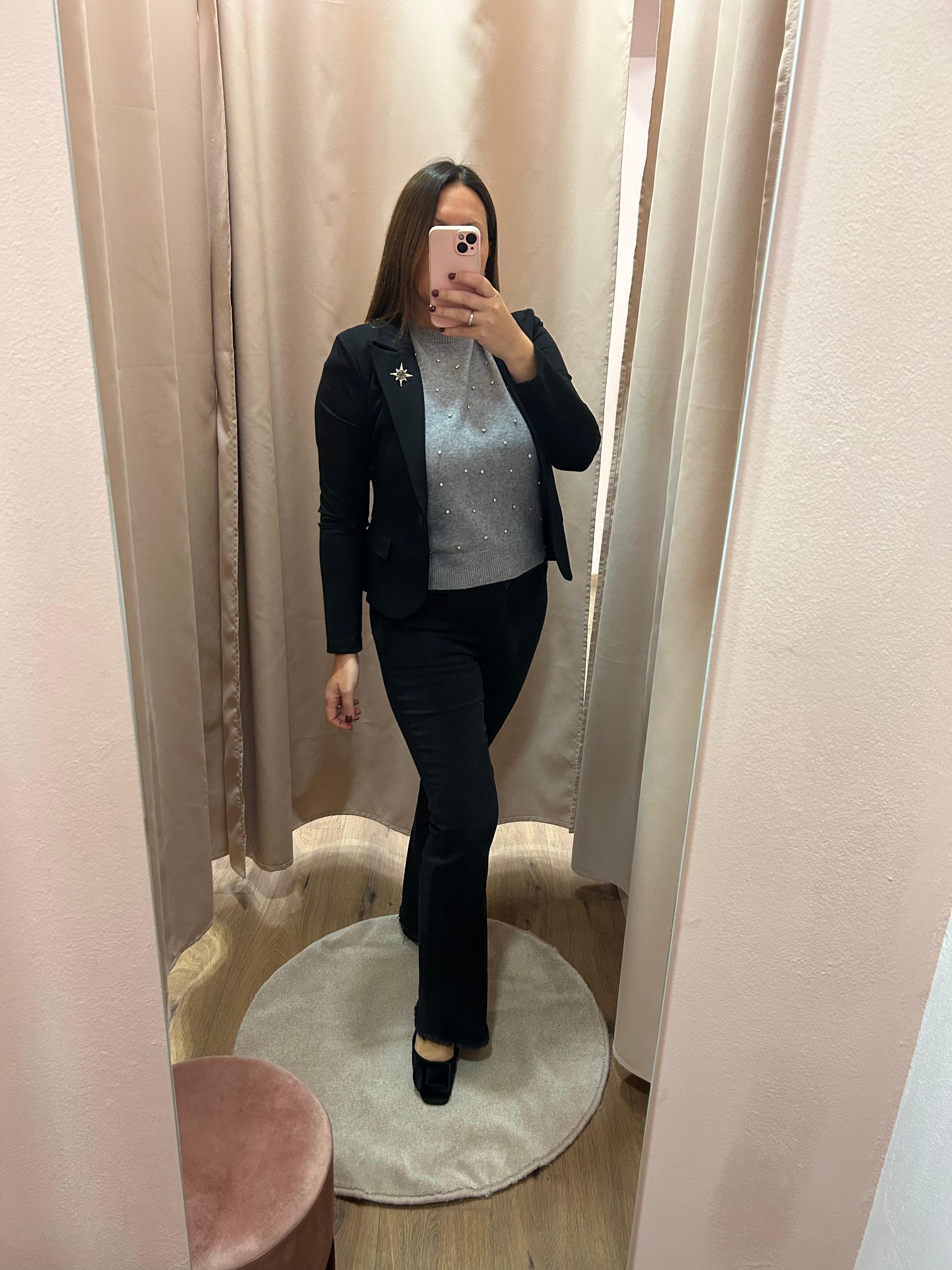 Giacca corta elasticizzata in punto Milano con spilla