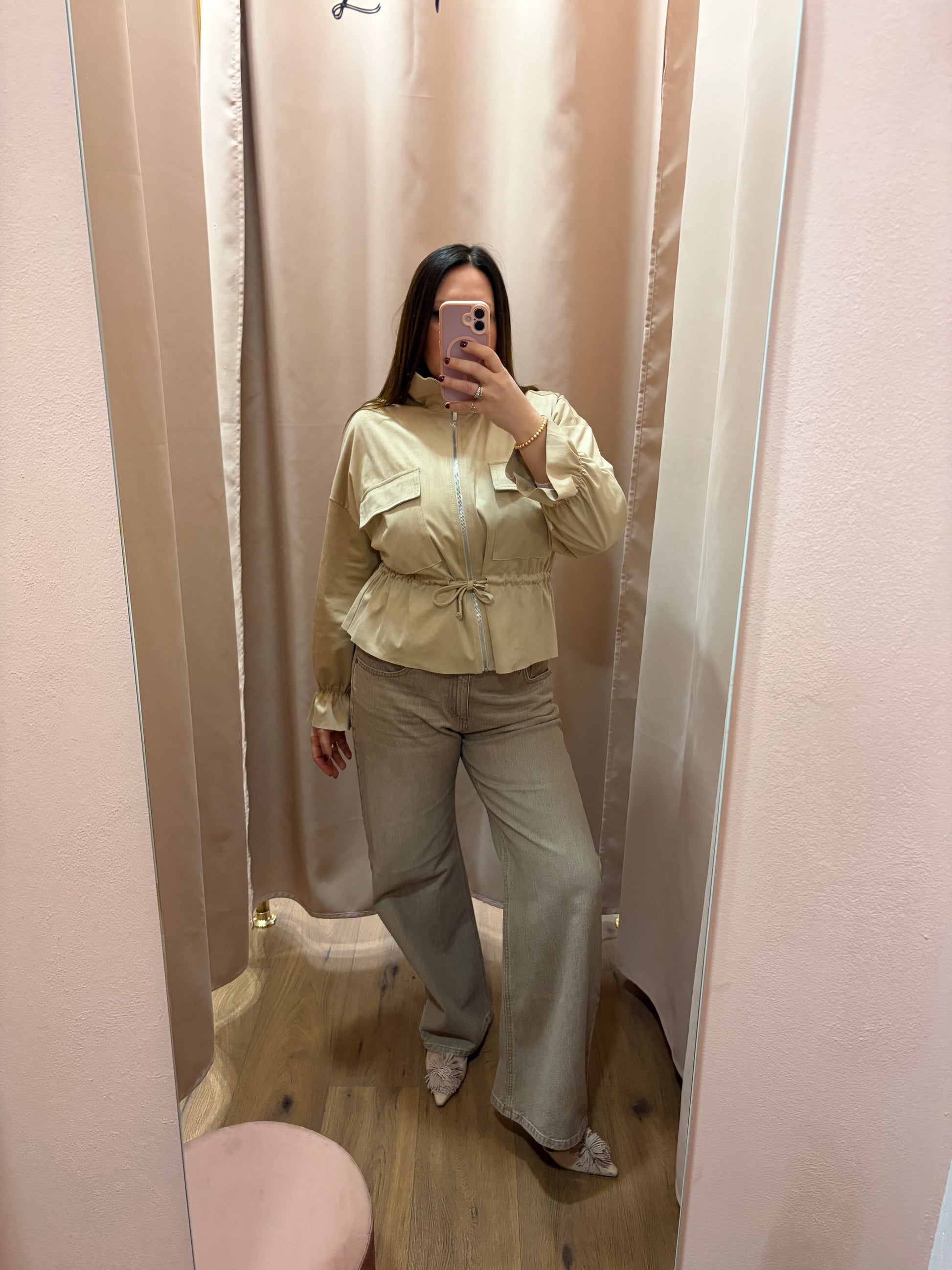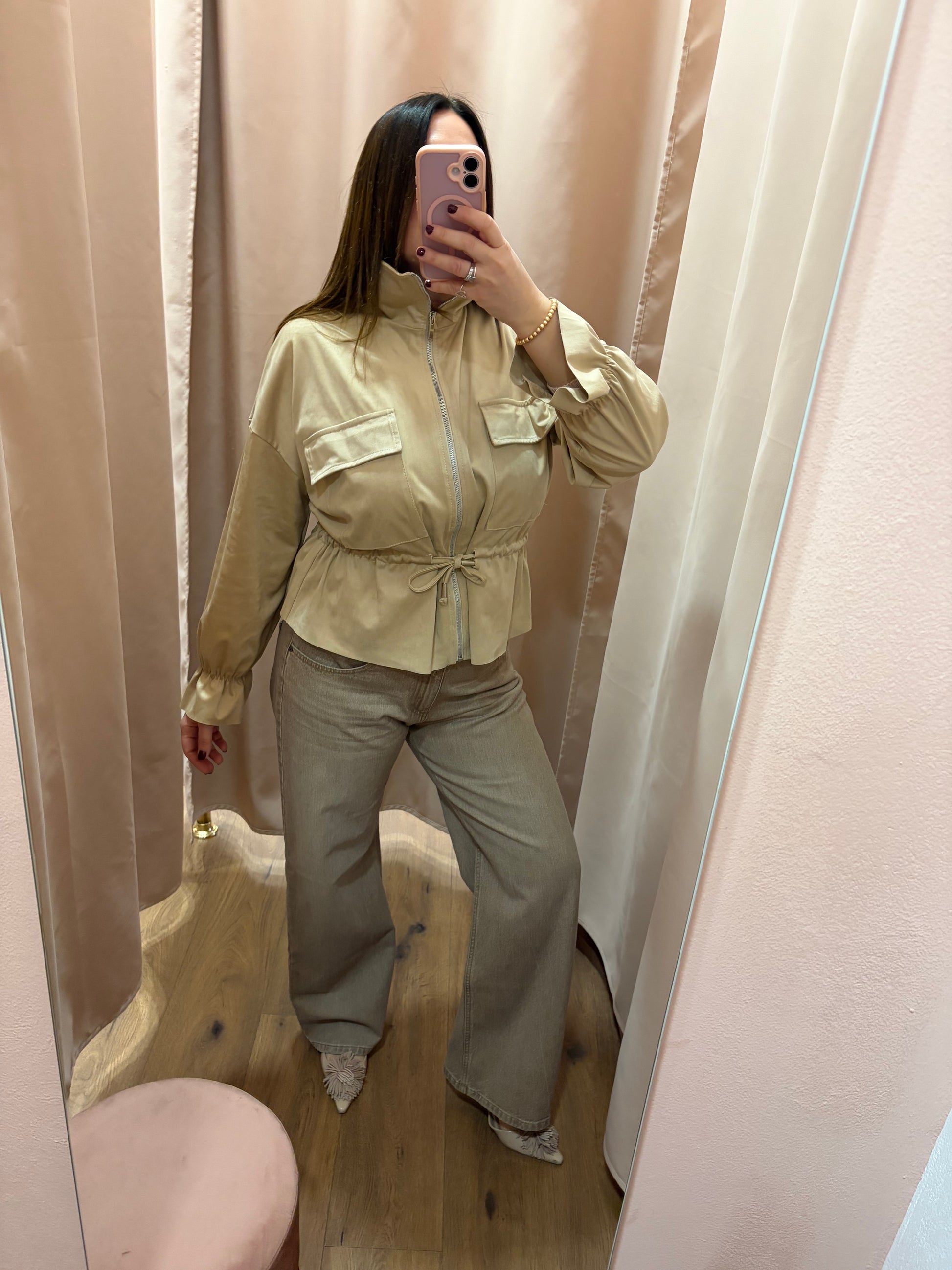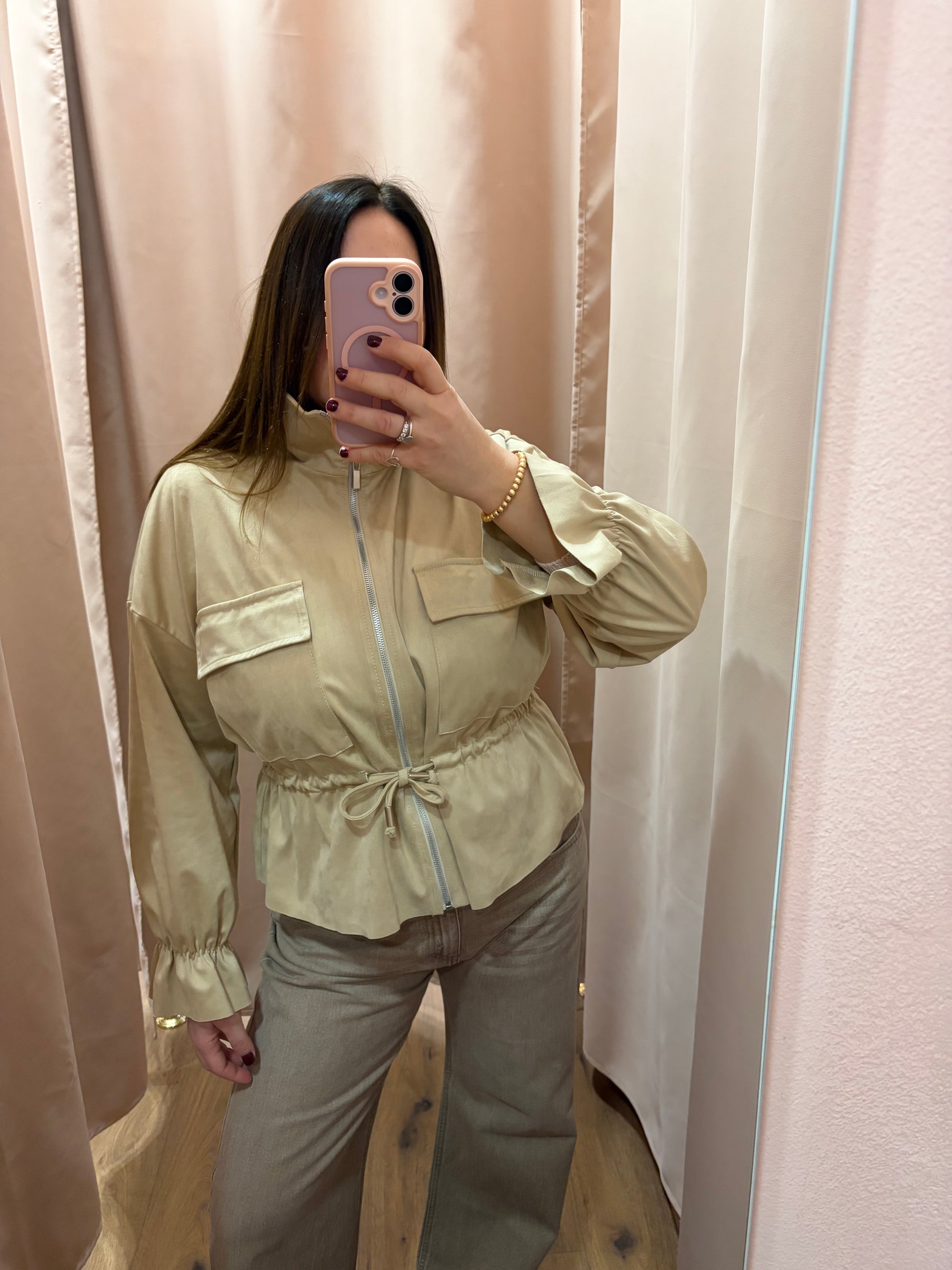 Giubbino scamosciato con coulisse in vita e manica a caramella
