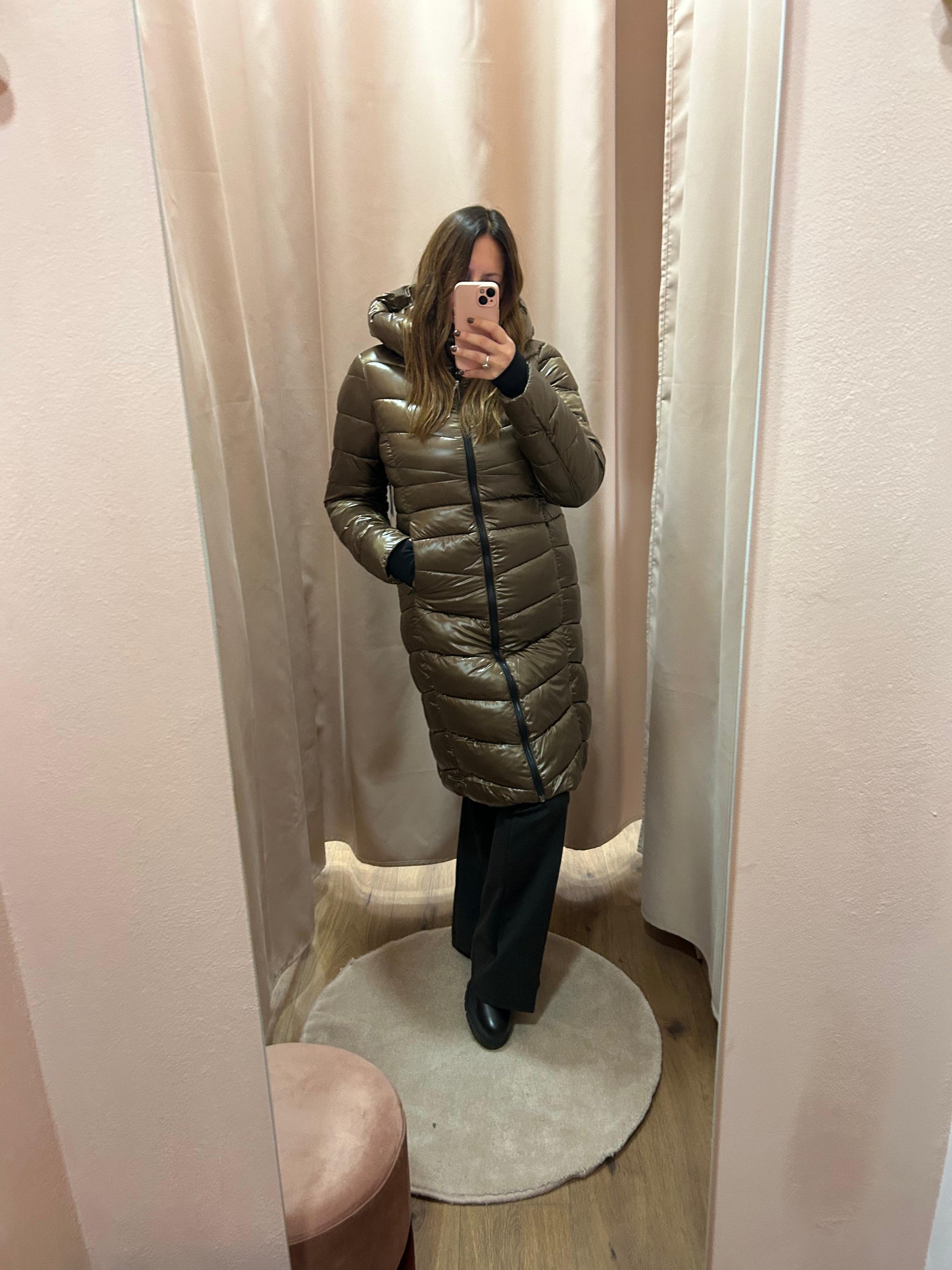 Piumino lungo imbottito e trapuntato con collo e cappuccio e zip con doppio cursore