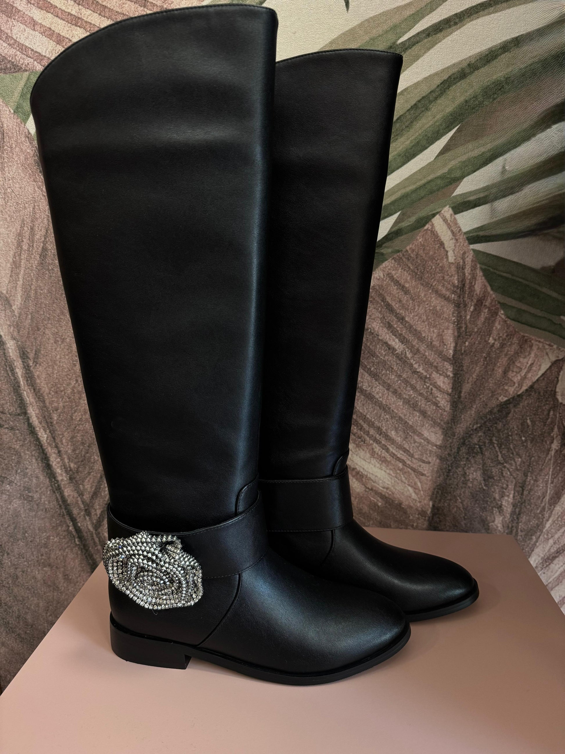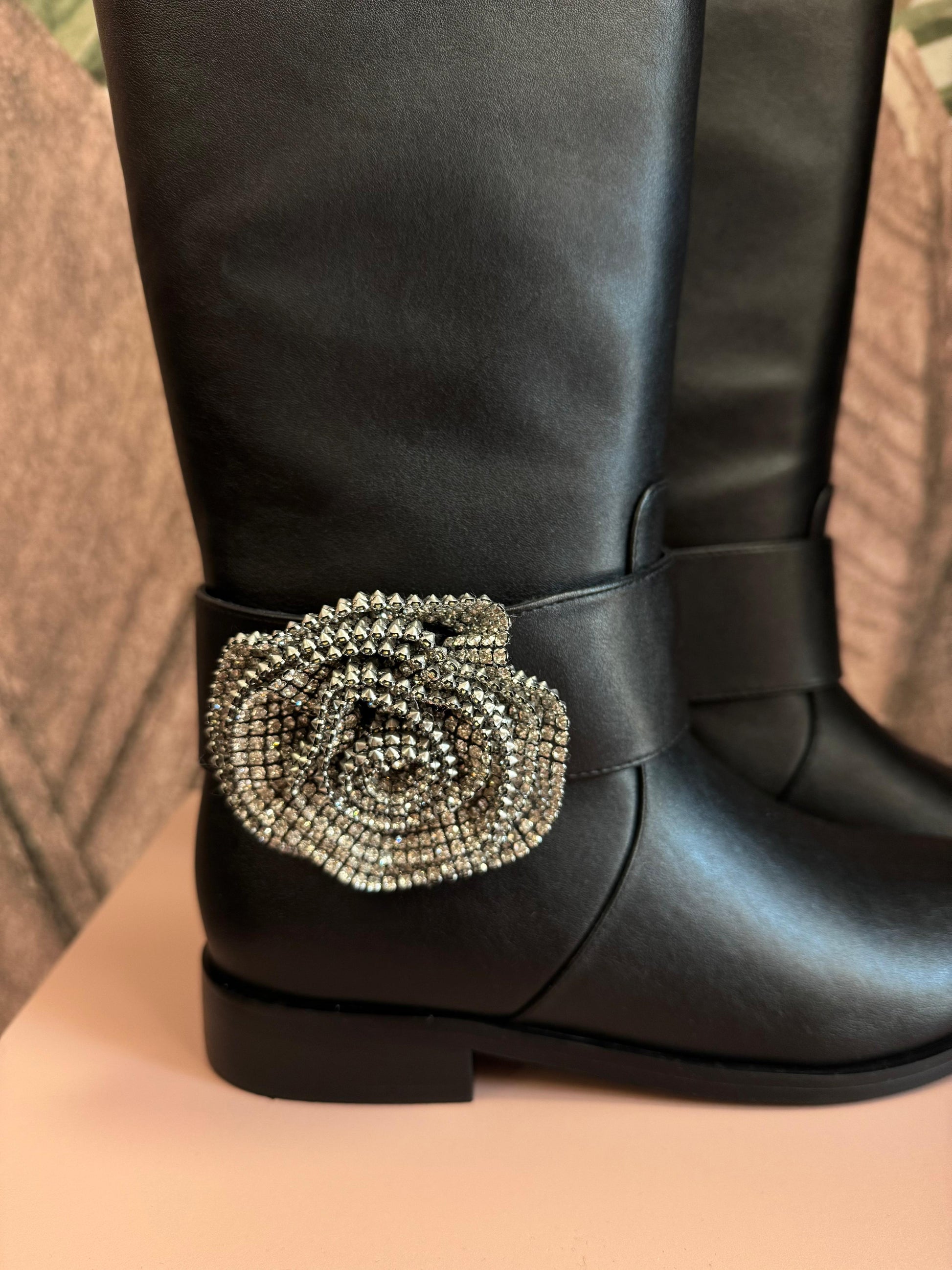Stivale con tacco basso, dotato di cinturino alla caviglia removibile con fiore gioiello