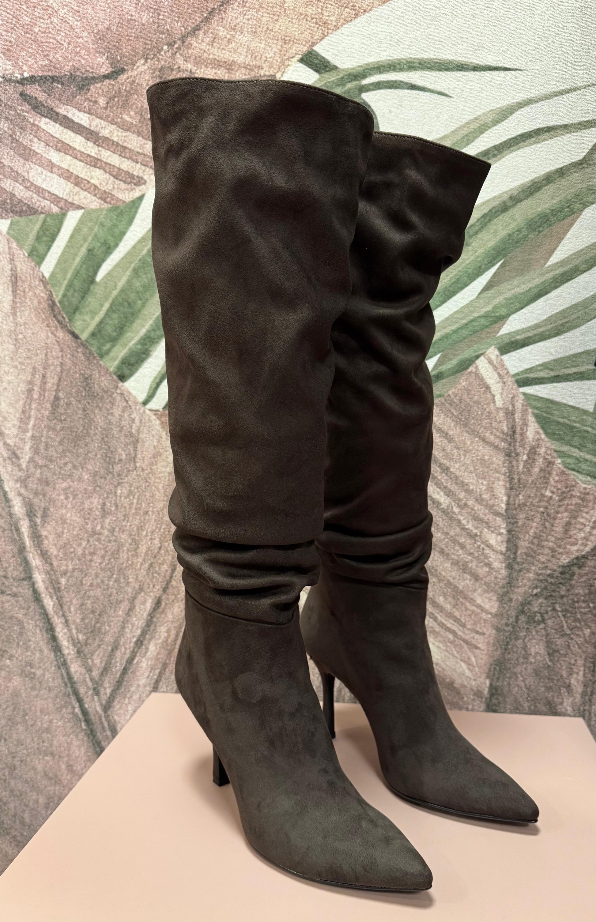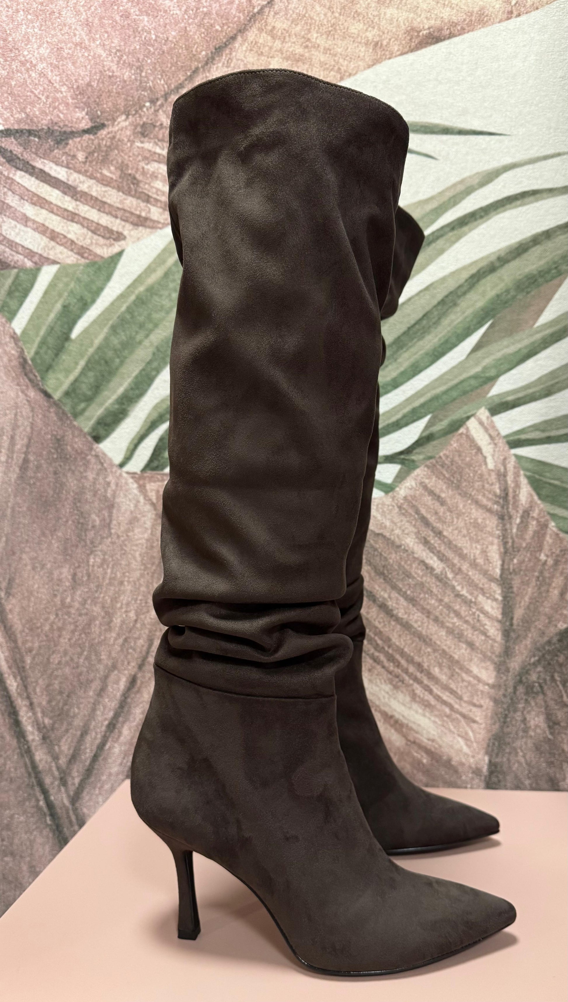 Stivale in camoscio a punta con tacco a spillo senza chiusura